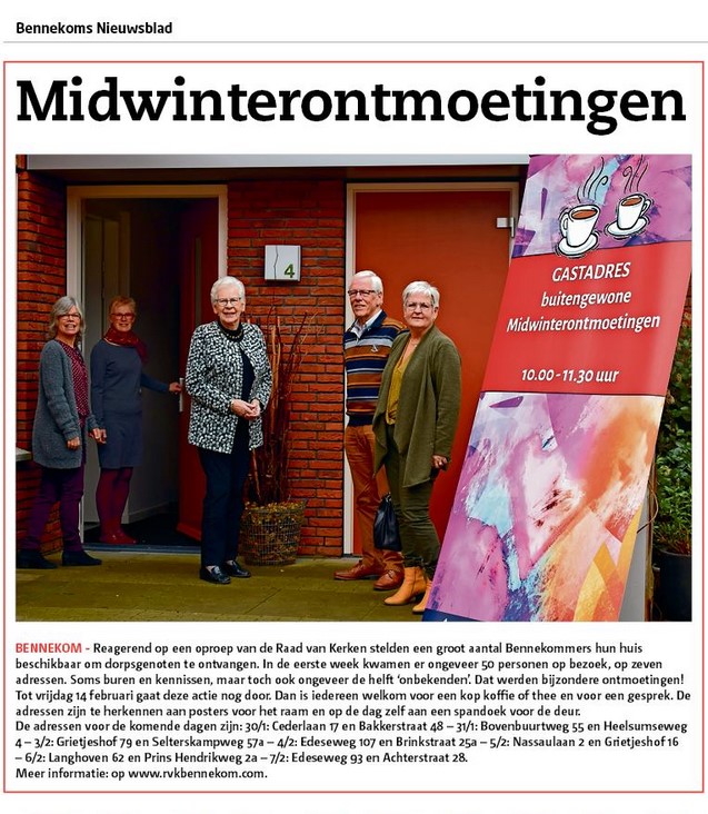 De “buitengewone midwinterontmoetingen” zijn nu halverwege. Naast Omroep Gelderland en EdeTV heeft ook het Bennekoms Nieuwsblad deze week weer aandacht aan dit mooie initiatief geschonken. Je vindt er de adressen die volgende week hun huis openstellen. Wees welkom!